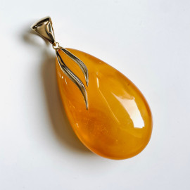 Big Yellow Baltic Amber Pendant, Teardrop Shape Gold-Plated Necklace